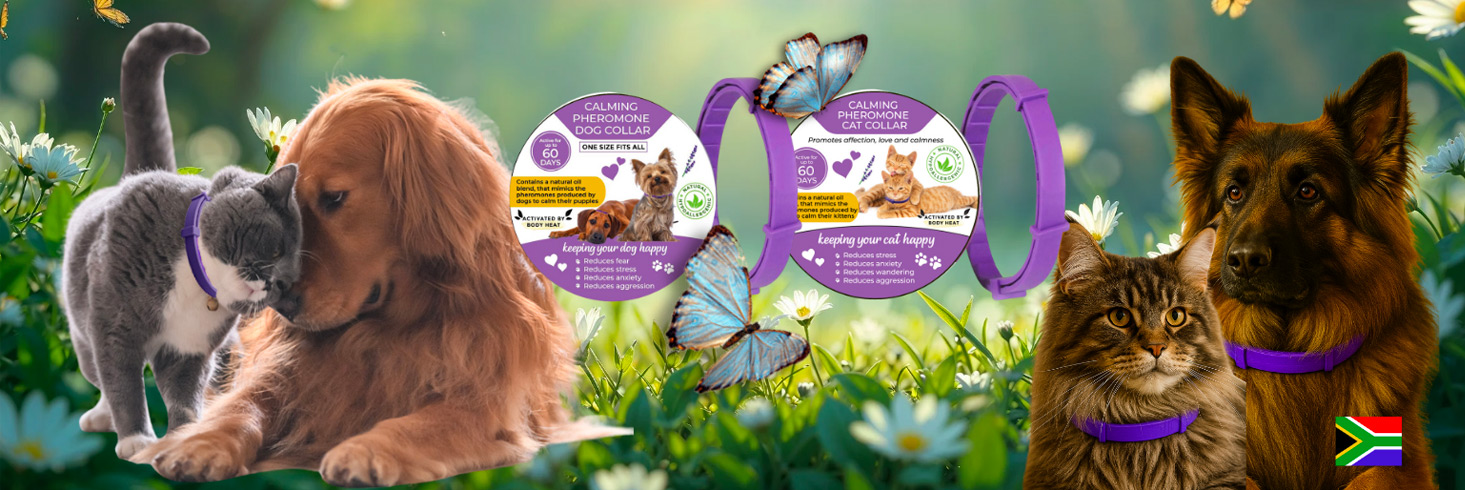 Our Calming Pheromone Collars contain a natural oil blend, that mimics the pheromones produced by cats/dogs to calm their kittens/puppies. Activated by body heat. Click here and view our FAQs page.